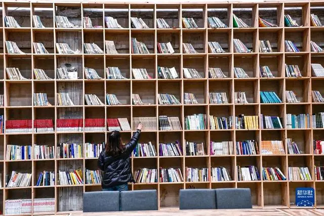 11月15日,帮扶干部在贵州省石阡县国荣乡楼上古寨乡村图书馆里整理图书。