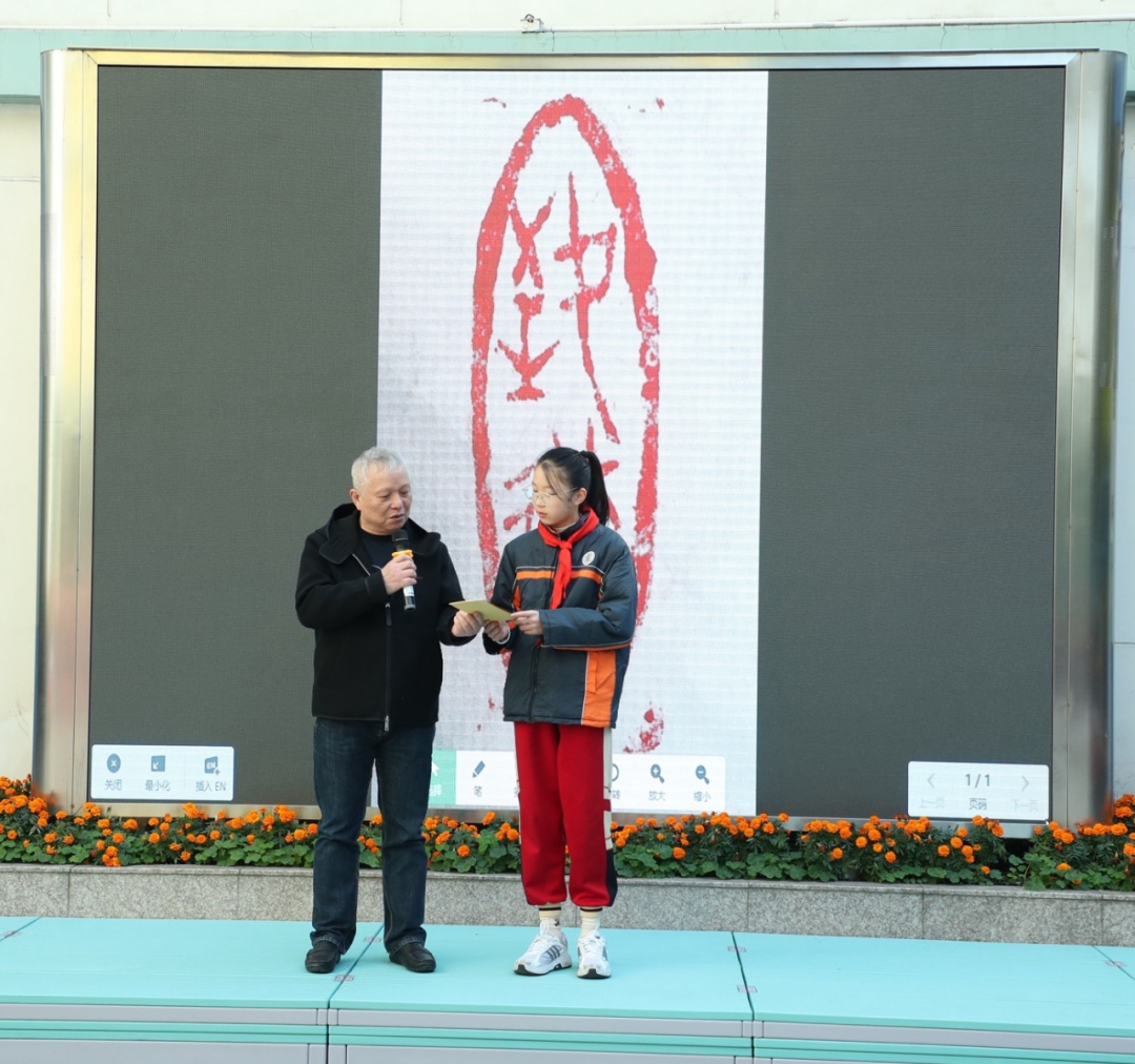 西泠印社社员、著名篆刻家陈辉,上海市书法家协会理事、著名书法家吴寒松,黄浦区书法家协会主席、著名书法家张伟舫对学生书画印作品进行了点评,并向学校师生赠送礼品,希望学校师生们继续以自信的姿态展示“字以人为奇,人以字立身”的美好追求。