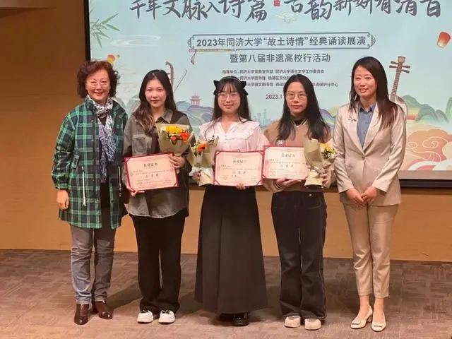 随后,活动还邀请此前在同济大学“故土诗情”经典诵读活动中获奖的学生代表上台朗诵,从唐代李白的《蜀道难》到岳飞的《满江红》,大家个个情绪饱满、慷慨激昂,体现出对诗词的爱好和追求。留学生们自己也登台,带来了一首诗词朗诵《江南》,配合着江南丝竹专业乐手的现场伴奏,别具一番诗情画意。