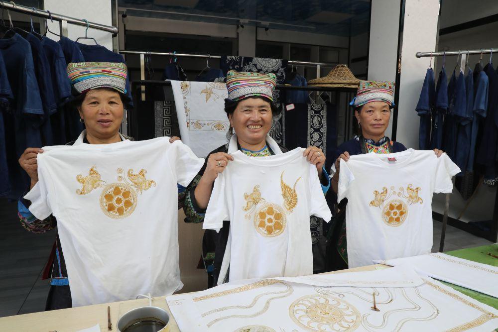 9月1日,苗族妇女姜老本(中)展示她和村民用蜡笔在T恤上画的“村超”足球。(李长华 摄)