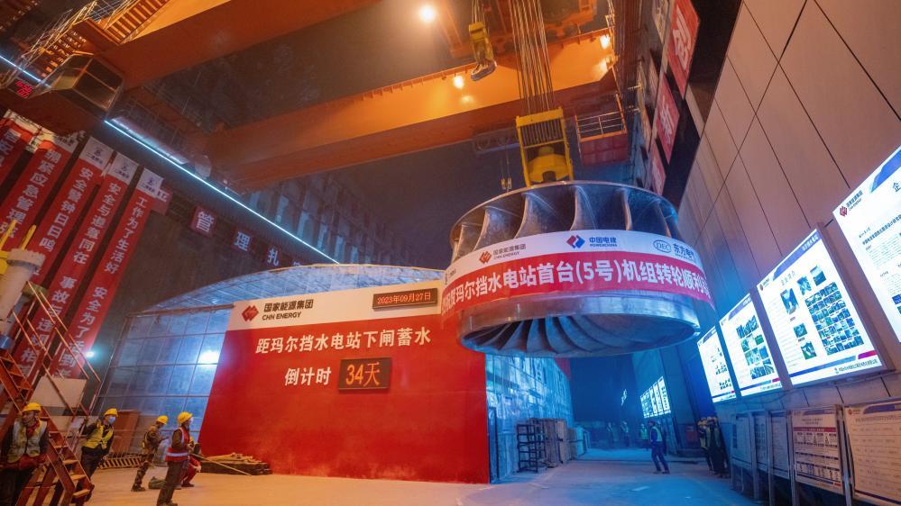 图为9月27日国家能源集团青海玛尔挡水电站首台机组水轮机转轮吊装现场。新华社发(潘彬彬摄)