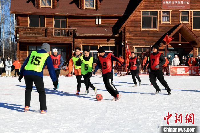 11月3日,游客在中国最北滑雪场参加雪地足球活动。邵天李摄