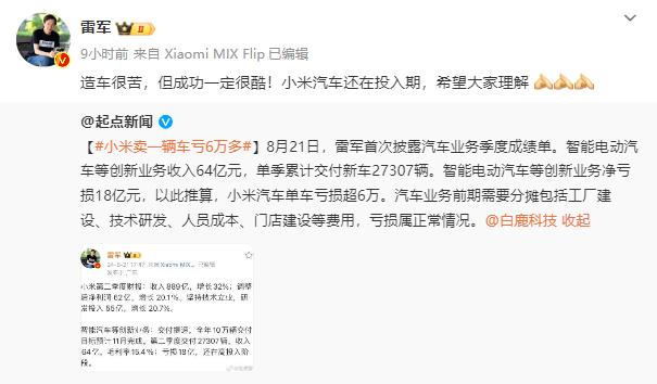 新华财经北京8月22日电 雷军21日首次披露汽车业务季度成绩单,随后“小米卖一辆车亏6万多”相关话题登上热搜。当天深夜,雷军在个人微博发文回应。