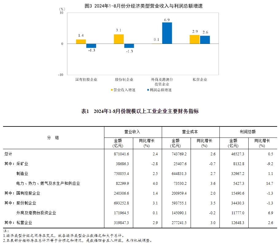 1—8月份,全国规模以上工业企业实现利润总额46527.3亿元,同比增长0.5%。