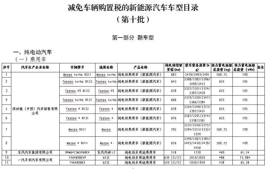 减免车辆购置税的新能源汽车车型目录(第十批)纯电动汽车-乘用车车型如下:
