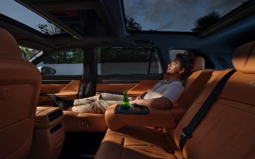 更令人称道的是其“空间魔法”。二排配备电动魔毯座椅,四分、六分腿托可独立调节。升起腿托,即可形成长达1.5米的舒适休息区;长途旅行时,放平副驾并升起后排左侧腿托,能组合成同级独有的2米+副驾L型贵妃榻,方便照顾家人;将后排座椅完全放倒,更能秒变同级唯一的2.4米超大双人床,露营观星从此无忧。