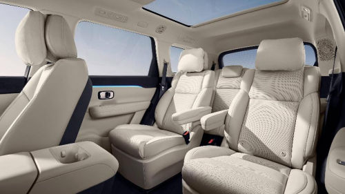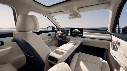 空间,是eπ008的“杀手锏”。近5米车长、3米轴距的“大块头”身材,让6座布局彻底告别“将就”。二排独立座椅间距直追豪华MPV,三排也能从容容纳成年人;即使满员出行,后备厢仍能轻松吞下3个28寸行李箱,露营装备、婴儿车、折叠自行车统统不在话下。对多口之家而言,这已不仅是车,更是一个移动的“家庭生活空间站”。