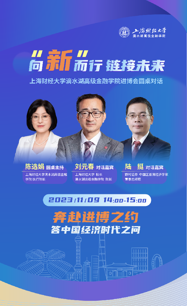 致力于弘扬百年商学文化,成为引领新兴金融发展的国际一流金融学院,作为“临港方阵”中重要一员,上财滴水湖高级金融学院奔赴进博之约。11月9日,学院将开展一场“向新而行,链接未来”主题圆桌对话。上海财经大学校长、滴水湖高级金融学院院长刘元春,野村证券中国区首席经济学家、董事总经理陆挺,上海财经大学滴水湖高级金融学院执行院长陈选娟联袂对话,共同探讨当下经济时代之问。