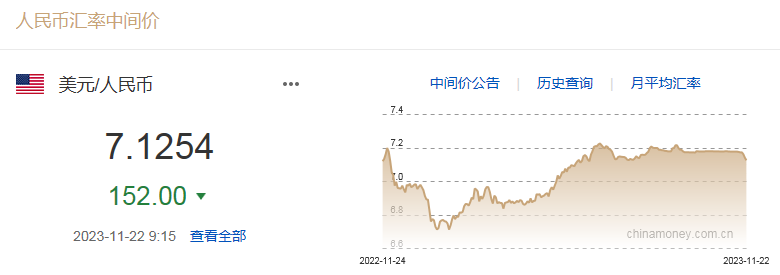中国外汇交易中心数据显示,11月22日,人民币对美元中间价调升152个基点,报7.1254。