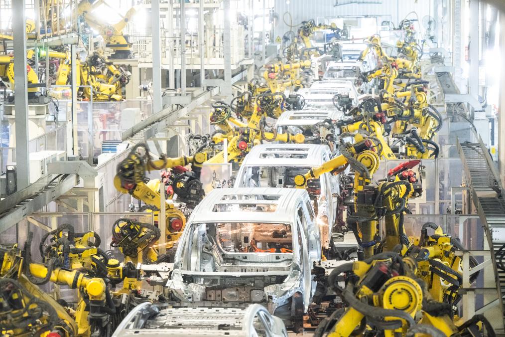 4月1日,在位于湖北武汉市经开区的岚图汽车电动化焊装车间,机器人在流水线上作业。新华社记者 肖艺九 摄