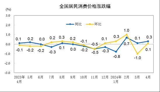 国家统计局数据显示,2024年4月,全国CPI环比上涨0.1%,同比上涨0.3%,同比连续三个月上涨。