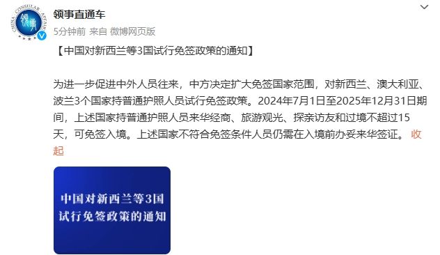 【中国对新西兰等3国试行免签政策的通知】为进一步促进中外人员往来,中方决定扩大免签国家范围,对新西兰、澳大利亚、波兰3个国家持普通护照人员试行免签政策。2024年7月1日至2025年12月31日期间,上述国家持普通护照人员来华经商、旅游观光、探亲访友和过境不超过15天,可免签入境。上述国家不符合免签条件人员仍需在入境前办妥来华签证。