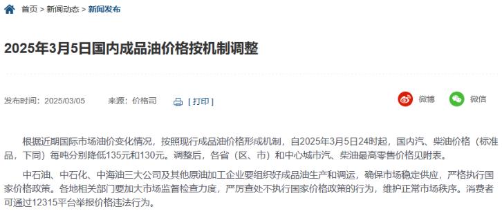 据国家发改委网站5日消息,根据近期国际市场油价变化情况,按照现行成品油价格形成机制,自2025年3月5日24时起,国内汽、柴油价格每吨分别降低135元和130元。...