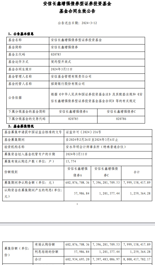 3月12日,安信基金管理有限责任公司发布安信长鑫增强债券型证券投资基金基金合同生效公告。...