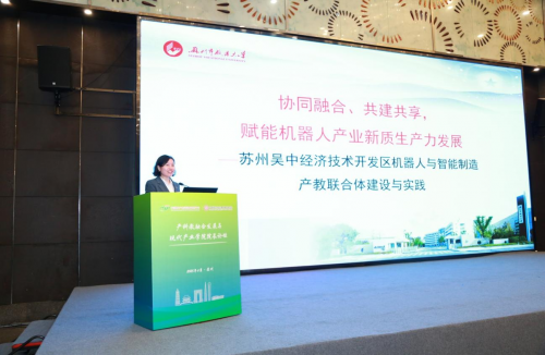苏州职业大学党委书记温贻芳围绕《协同融合、共建共享,赋能机器人产业创新生产力发展——市域产教联合体的实践与创新》展开分享,剖析市域产教联合体“协同、共享”逻辑,以苏州吴中区实践为例,详解产教资源整合、创新生态构建路径,为产业集群与教育集群协同发展提供可复制经验。