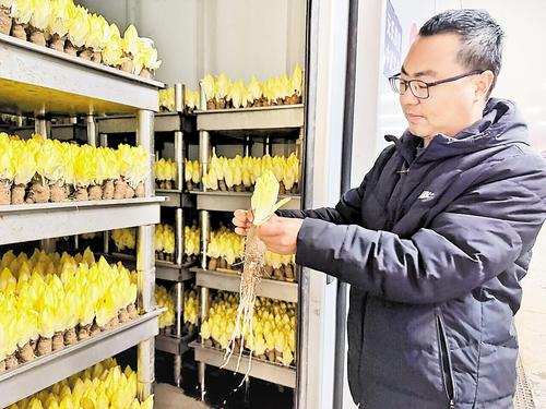 12月16日,河北联兴佳垚农业科技有限公司生产经理刘亚东向记者介绍黄色芽球菊苣。河北日报记者 白 云摄