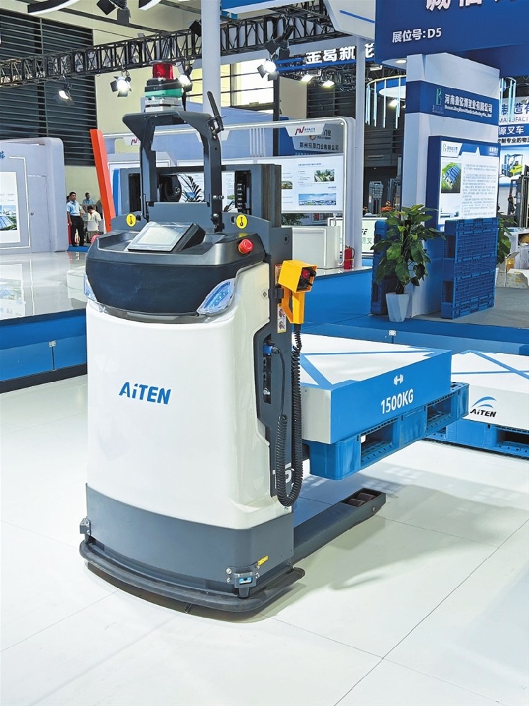 2024中国郑州物流博览会上展示的海豚之星举高型机器人,其最大载重1500公斤,举高1.6米。 本报记者 胡舒彤 摄