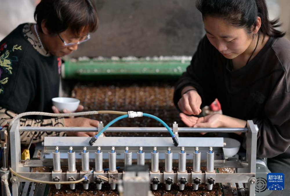 3月10日,河北省唐山市曹妃甸区第六农场一家育苗基地的工作人员往育苗盘上播撒蔬菜种子。...