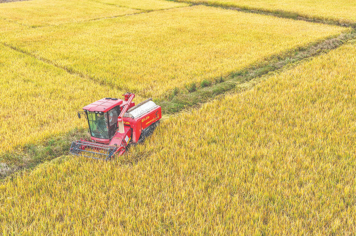 10月28日,湖南省永州市道县梅花镇棠下村,农机手驾驶机械收割晚稻(无人机照片)。 农业农村部最新农情调度显示,目前,全国秋粮主产区收获已超八成半。...
