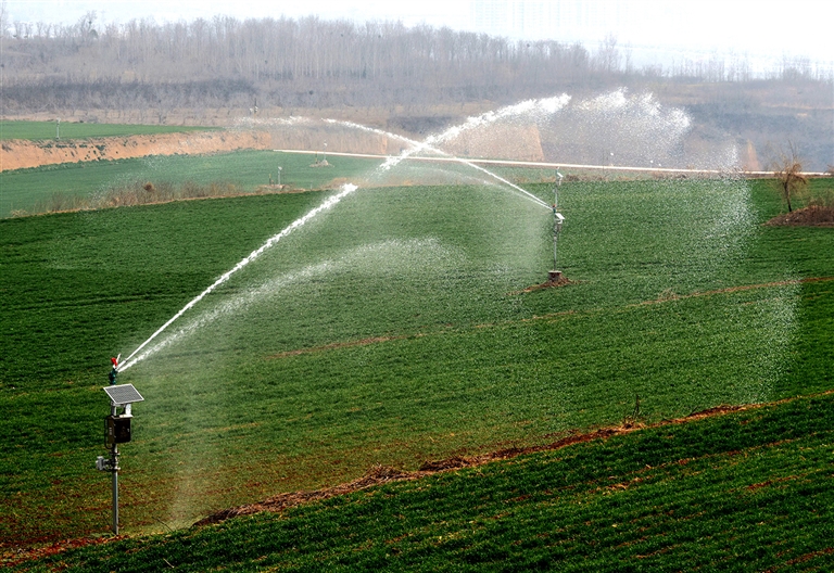 3月1日,洛阳市孟津区城关镇贾滹沱社区高标准农田示范区,太阳能智能高压喷头喷出的水,均匀地洒落在麦田里。郑占波 郝翔翔 摄