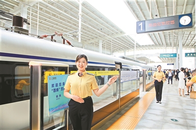 列车到达东莞麻涌站,乘务员在现场指引。广州日报全媒体记者骆昌威 摄