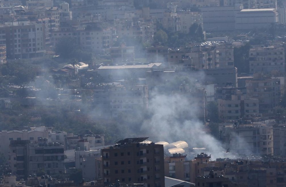 9月29日,在黎巴嫩首都贝鲁特南郊,遭袭现场升起浓烟。新华社发(比拉尔·贾维希摄)