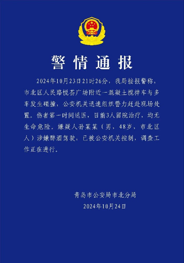 通报称,23日21时26分,市北区人民路悦荟广场附近一混凝土搅拌车与多车发生碰撞,伤者第一时间送医,目前3人留院治疗,均无生命危险。嫌疑人孙某某(男,48岁,市北区人)涉嫌醉酒驾驶,已被公安机关控制,调查工作正在进行。