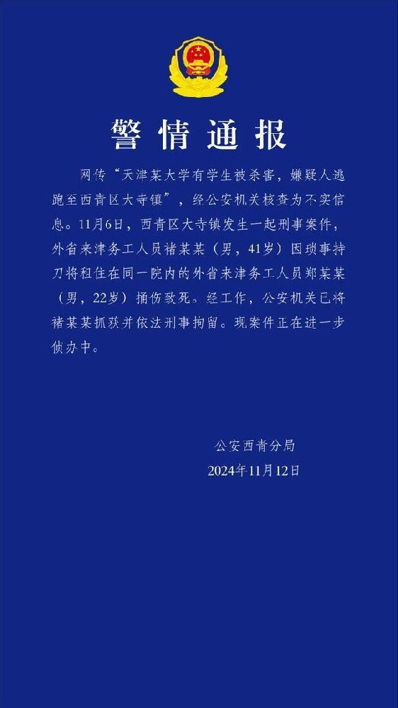 天津警方通报网传“天津某大学有学生被杀害”:为不实信息