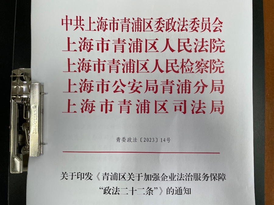 青浦区在全市率先制定出台关于加强企业法治服务保障"政法二十二条”。今年5月,经区委常委会审议通过,区委政法委牵头区政法条线各单位联合印发《青浦区关于加强企业法治服务保障“政法二十二条”的实施意见》,提出五个方面共22项改革创新举措,把对企业的法治服务保障从事后司法救济拓展至风险预判、合规指引、纠纷多元化解等事前司法护航领域,服务各市场主体更好应对各种风险,让法治服务保障“看得见、摸得着”。
