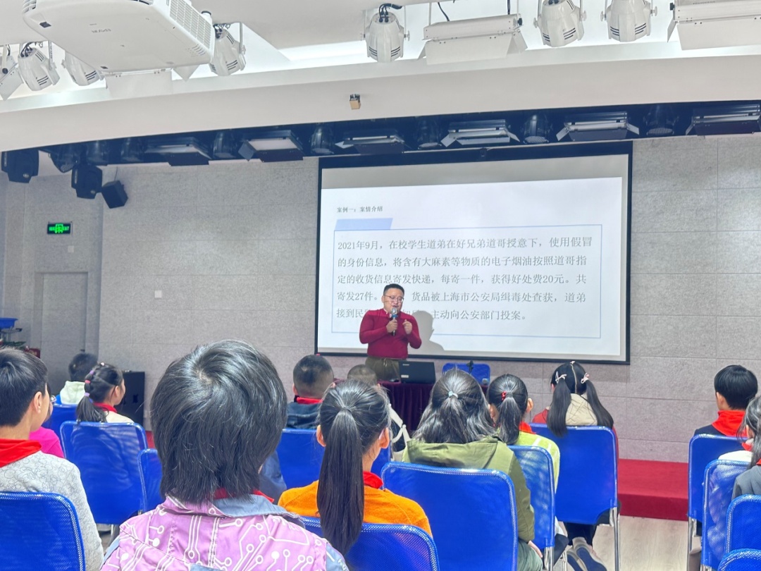 讲座通过四个发生在学生们身边的案例入手,围绕“校园侵害”和“网络诈骗”两个近期较热门的主题,在讲述典型案例的同时,抽丝剥茧剖析其中蕴含的法律知识,用通俗易懂的语言告诉学生们如何警惕身边的陷阱。 针对校园侵害问题,工作人员以其危害性导入,给予同学们告诫和提醒: 1. 交友时要把好关,对身边所谓“兄弟”“朋友”之类的话不要盲从,尤其是涉及到经济利益时更要警惕,不要轻易被拉下水。 2. 遇事不要有侥幸心理,一时冲动可能导致高昂的代价。 3. 人身安全是第一位的,一旦发生冲突要及时告知老师或家长。 针对网络诈骗问题,工作人员结合案例向大家普及了当前常见的电信诈骗的手段、特点、形式以及危害,提醒大家不要在网络上轻易泄露个人信息,更不要贪小便宜,提高警惕保护自己。