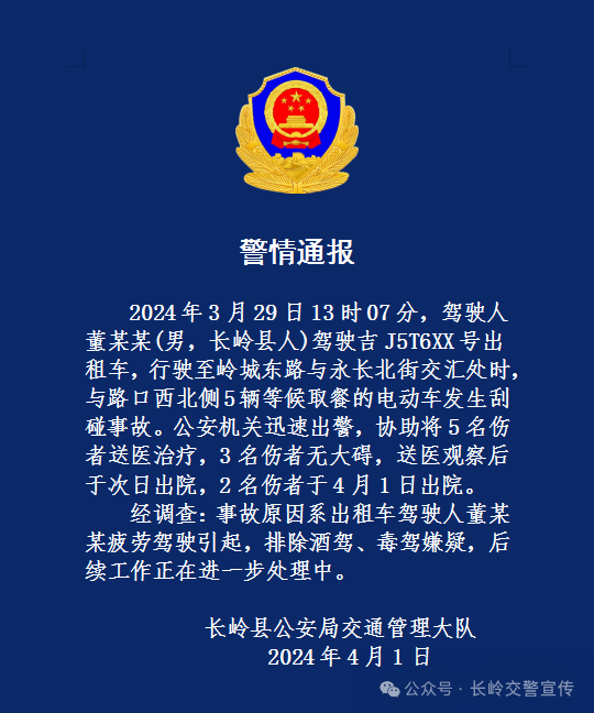 通报称,2024年3月29日13时07分,吉林松原长岭,驾驶人董某某驾驶吉J5T6XX号出租车,行驶至岭城东路与永长北街交汇处时,与路口西北侧5辆等候取餐的电动车发生刮碰事故。公安机关迅速出警,协助将5名伤者送医治疗,3名伤者无大碍,送医观察后于次日出院,2名伤者于4月1日出院。