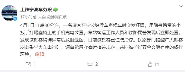 中新网4月2日电 据上海铁路局宁波车务段官方微博通报,4月1日11点30分许,一名旅客在宁波站候车室候车时突发狂躁,用随身携带的小扳手打砸座椅上的手机充电装置。车站客运工作人员和铁路民警发现后立即处置,发现该旅客精神异常后及时送医。目前该旅客已住院治疗。铁路部门提醒广大旅客朋友乘坐火车出行时,请自觉遵守客运相关规定,共同维护好安全文明有序的旅行环境。