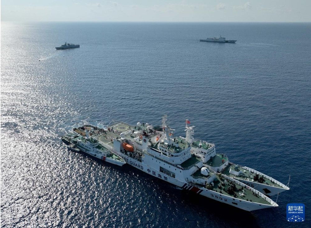 5月13日,中国海警3502舰为其他执法舰艇进行海上补给(无人机照片)。