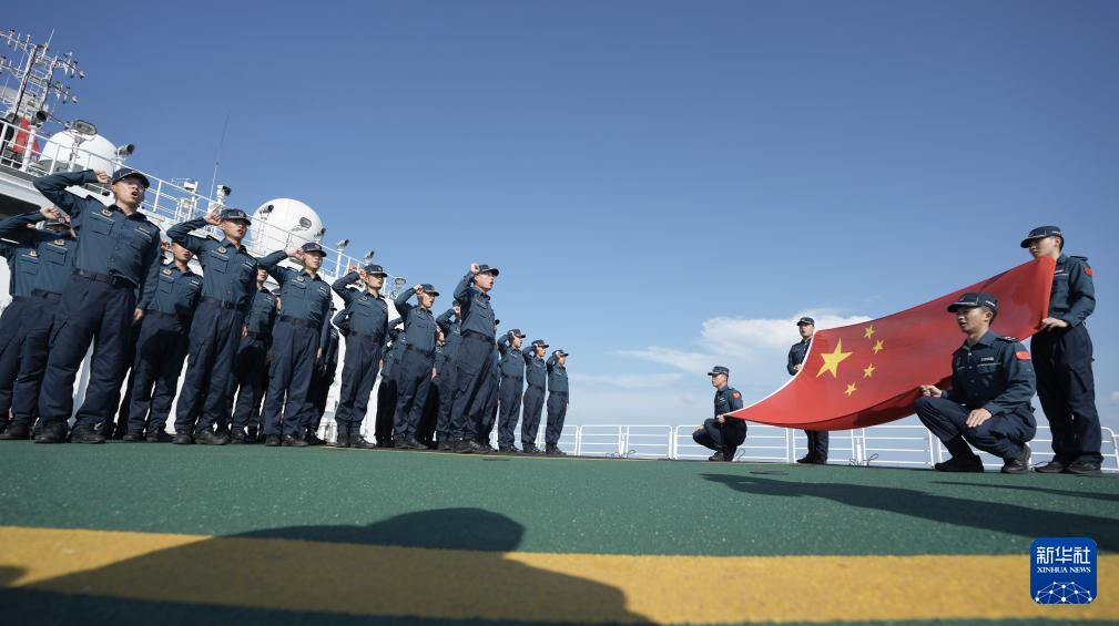 5月13日,中国海警3502舰组织执法员举行向国旗宣誓仪式。