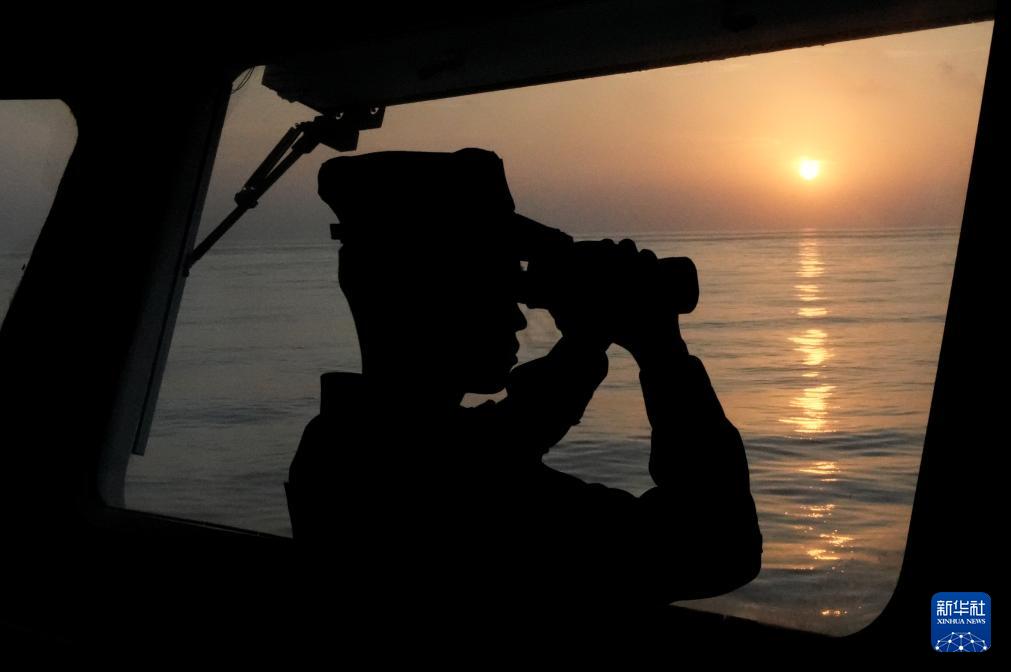 5月12日,中国海警3502舰执法员进行瞭望观察。
