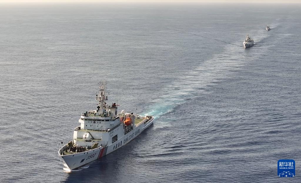 5月12日,中国海警3502编队进行编队航行训练(无人机照片)。