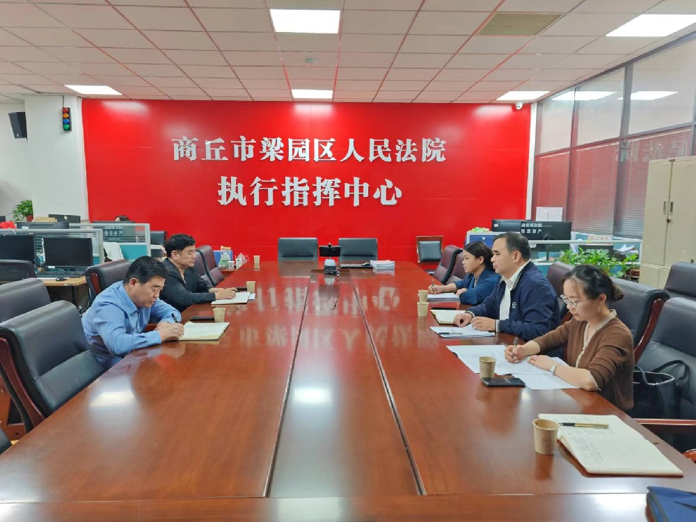 10月7日上午,中秋国庆双节过后第一个工作日,商丘市中级人民法院执行局副局长马昊,带领质效专员高蓝盾、终本专员郝靖宇、卷宗管理专员杨婷,来梁园区法院调研督导执行工作,围绕卷宗管理中心实体化运行、事务集约办理、专员功能发挥、终本案件管理等工作,逐项进行全面检查,现场反馈发现问题,提出具体指导意见。...
