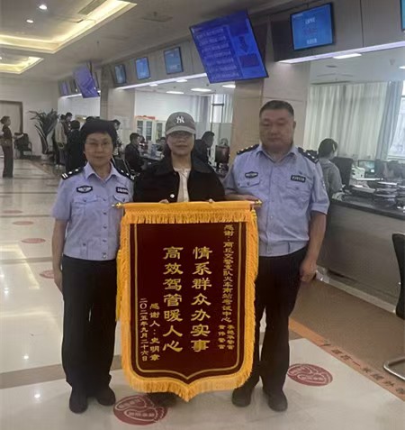 9月25日,市民史先生委托其妻子来到商丘市政务服务中心公安驾管窗口,将一面镌刻着“情系群众办实事 高效驾管暖人心”的锦旗送到理论考场负责人李艳华、黄伟手中,以此表达对考场高效优质服务的高度赞扬和诚挚感谢。...