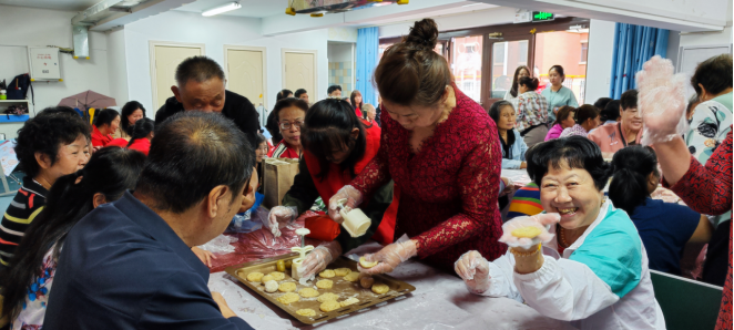 居民陈阿姨做完月饼开心地展示给大家看,情不自禁吟诗一首,“月儿圆、月饼香,香香的月饼送温暖。”现场欢笑声不断,美好而又温馨。