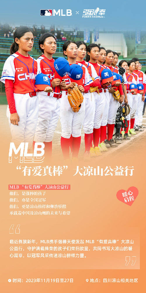 11月19日,MLB美职棒大联盟携手强棒天使公益项目发起MLB“有爱真棒”大凉山公益行,护送强棒天使公益组织内50余名彝族冠军队员,从北京启航荣耀归乡共度彝族农历新年,用多样的关怀温暖冠军少年们的归家路,共同践行社会责任。