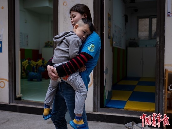 4月23日,北京市朝阳区金盏乡小店村,橘子老师抱着儿子莯莯。每周一到周五,莯莯都会和妈妈一起到亲子园“上班”。