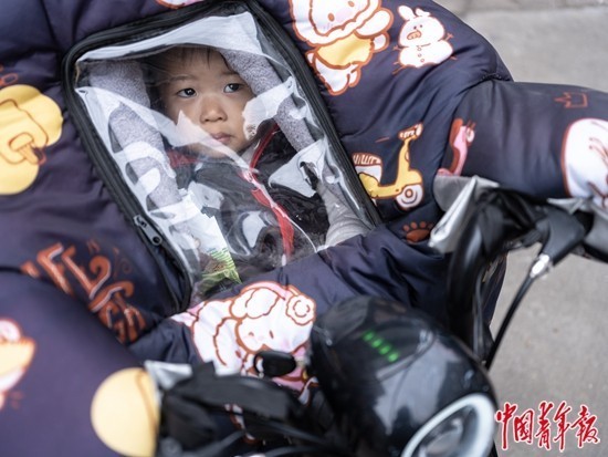 4月23日,北京市朝阳区金盏乡小店村,甘泉坐在奶奶的电动车里,准备回家吃午饭。