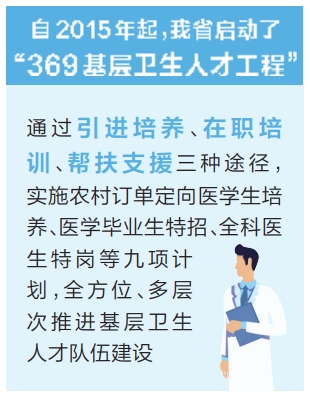 省卫生健康委相关负责人介绍,自2015年起,我省启动了“369基层卫生人才工程”,通过引进培养、在职培训、帮扶支援三种途径,实施农村订单定向医学生培养、医学毕业生特招、全科医生特岗等九项计划,全方位、多层次推进基层卫生人才队伍建设。