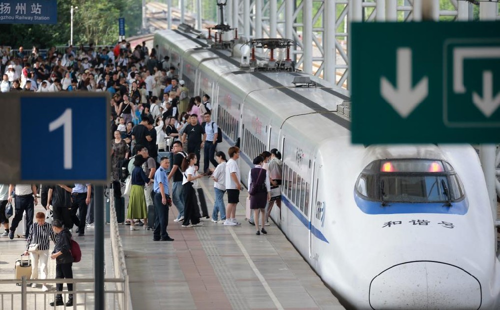 9月29日,旅客在江苏扬州火车站站台乘车出行。2024年铁路国庆黄金周运输自9月29日开始。新华社发(孟德龙摄)