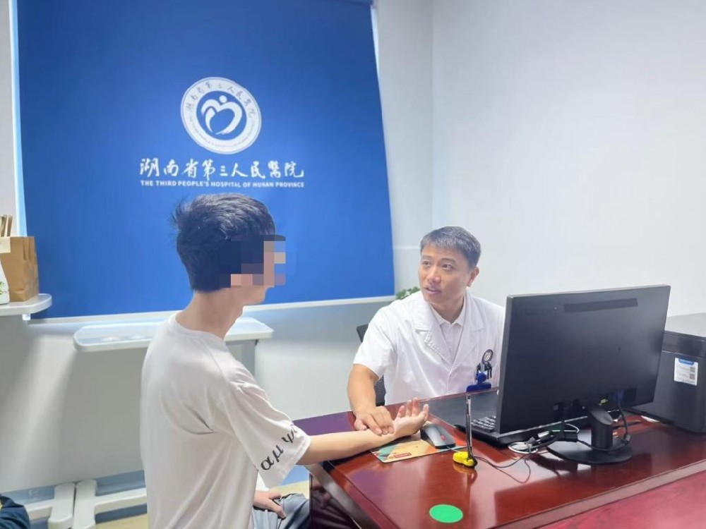 9月19日,在湖南省第三人民医院,医生正在给年轻的痛风患者诊断。(受访者供图)