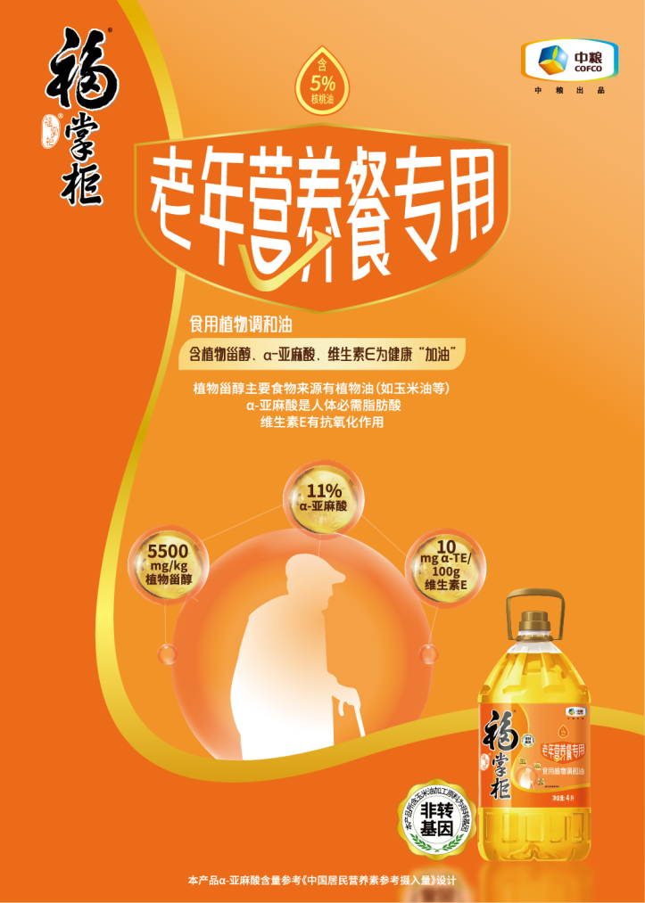福掌柜老年营养餐专用食用植物调和油和福掌柜减盐特级生抽是中粮餐饮发布的又一人群专用系列定制化研发产品。此前,针对校餐学生群体、职场白领群体中粮餐饮已成功推出相对应的福临门学生营养餐专用食用植物调和油与福临门团膳营养餐专用食用植物调和油等定制化产品。