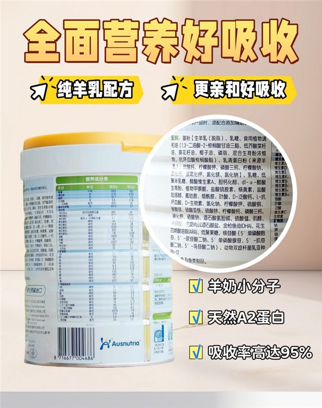 佳贝艾特悦白采用了最新升级的安敏源乳清作为原料,过敏原β-乳球蛋白降低了11%,比普通羊乳清更低。另外,山羊奶本身的过敏原蛋白αs1酪蛋白含量也比牛奶少85%,等于是从两大主要源头减少了过敏风险。更有说服力的是,佳贝艾特联合北京大学医学部的临床喂养研究显示,喝悦白的宝宝,出现敏感问题的几率直接降低42%。这对于牛奶粉过敏的宝宝来说,无疑是一个很好的选择。