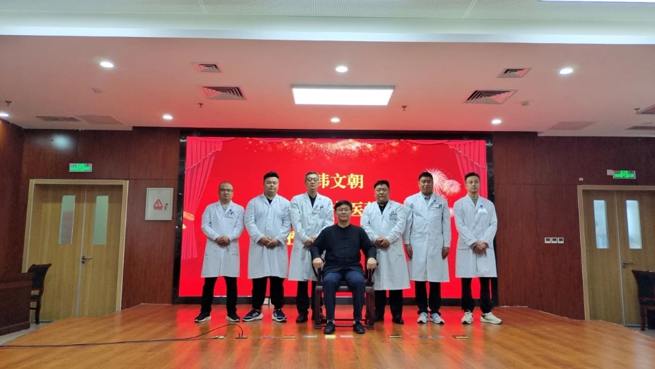 骨一科主任王晓冰,医师范雨蒙、许永杰;骨二科主任陈松杰,医师肖冠琪、王永旺向韩院长行拜师礼。建立了师生友谊,自此他们将共同在骨伤科领域创新发展。