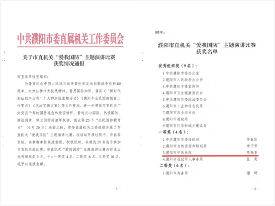 8月14日,濮阳市直机关“爱我国防”主题演讲比赛圆满落幕。濮阳市中医医院儿科护士陈晓菲用满怀激情、真诚动人的演讲,在20位选手中脱颖而出,荣获一等奖。...