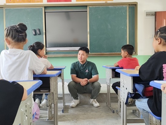 青崖小学的教室里传来琅琅读书声,此时湖南高速铁路职业技术学院的学生孔俊岩正一句一句地用普通话教学生们念课文。